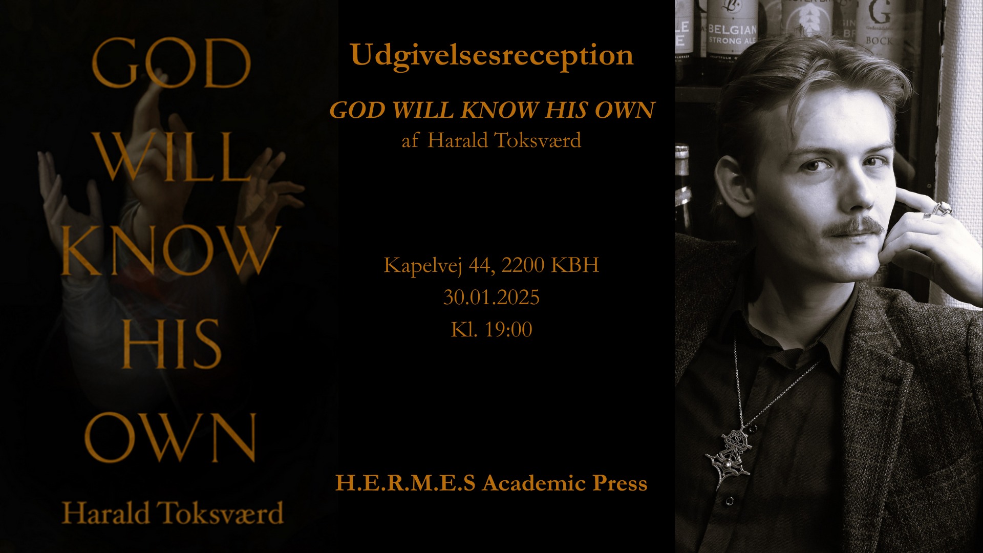 Harald Toksværd udgiver d. 30. januar sin anden roman GOD WILL KNOW HIS OWN på H.E.R.M.E.S Academic Press. Udgivelsen fejres i kulturhuset på Kapelvej 44, hvor der vil være oplæsninger, musik og mulighed for at købe bogen.